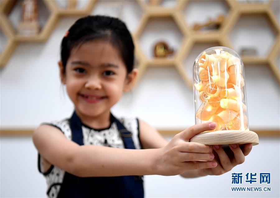 7月31日,一名小朋友在展示制作的木工作品。 暑假期间,河北省石家庄市桥西区总工会开设“小鲁班课堂”,由专业老师教授木工技艺,让小朋友们“零距离”体验传统文化,提高动手能力,培养匠心精神,乐享暑假。