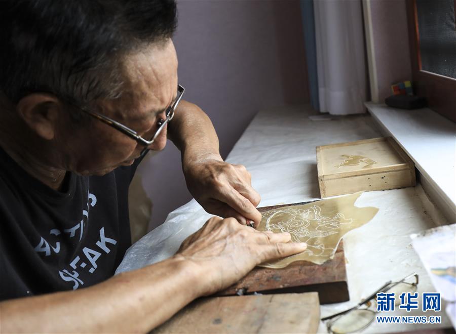 8月1日,皮影艺人蔡善存在家中雕刻制作皮影。 新华社记者 兰红光 摄