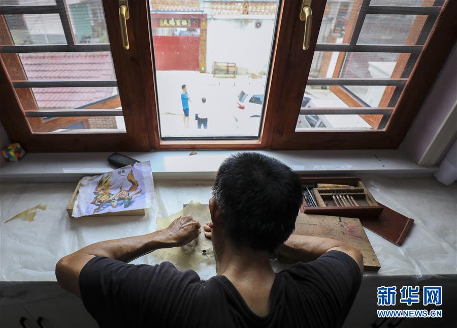 8月1日,皮影艺人蔡善存在家中雕刻制作皮影。 新华社记者 兰红光 摄