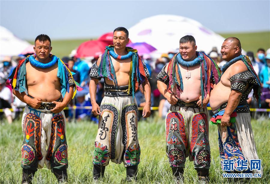 8月2日,搏克手准备进行搏克比赛。当日,锡林浩特市游牧文化节·白音锡勒牧场建场70周年那达慕在锡林浩特市白音锡勒牧场拉开帷幕。赛马、搏克、射箭等蒙古族传统项目吸引游客前来观看。新华社记者 彭源 摄