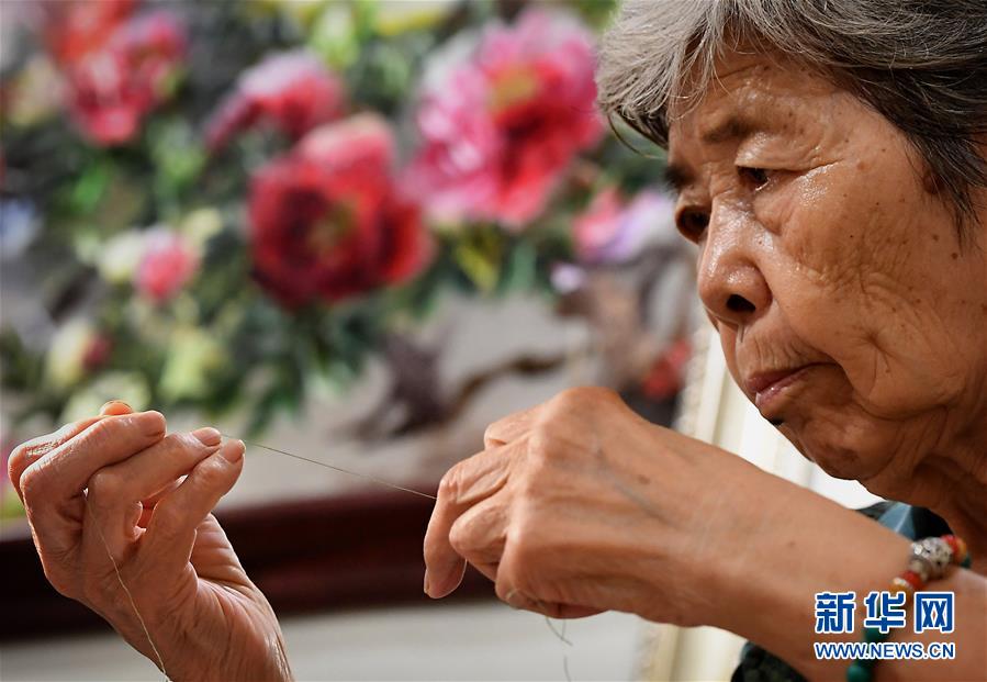 在开封市素花宋绣工艺有限公司的展示馆里,王素花在劈线(7月30日摄)。 新华社记者李安摄