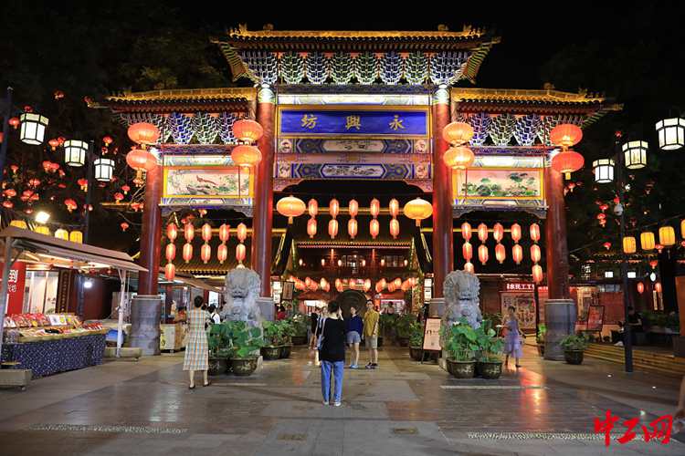 2020年8月4日,西安永兴坊美食街区,关中和陕南特色的百余种特色美食和非遗文创产品,吸引着夜游的民众和暑期游客“打卡”,繁荣了城市夜经济。彭华/视觉中国