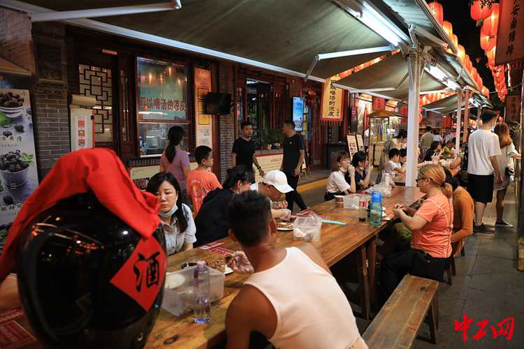 2020年8月4日,西安永兴坊美食街区,关中和陕南特色的百余种特色美食和非遗文创产品,吸引着夜游的民众和暑期游客“打卡”,繁荣了城市夜经济。彭华/视觉中国