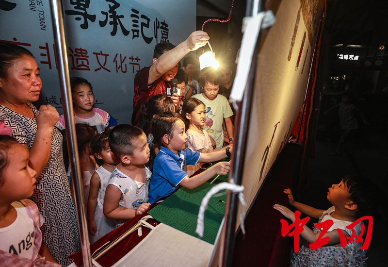 2020年8月2日,陕西渭南,现场观众体验皮影表演。王警/视觉中国