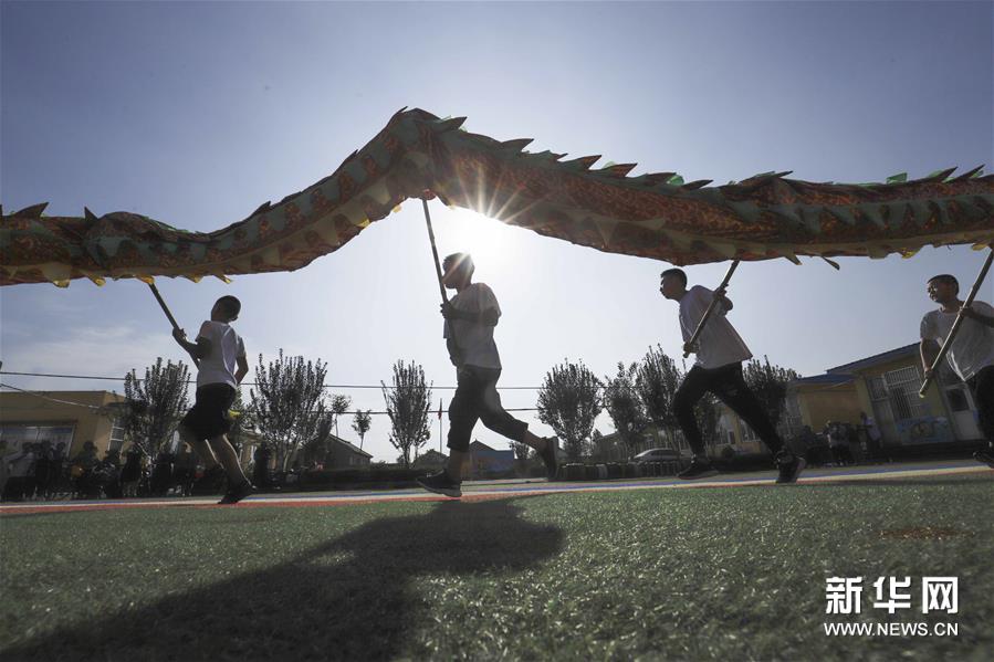 8月4日,孩子们在河北省遵化市平安城镇大麻各庄村校园操场练习民俗节目。暑假期间,河北唐山遵化市平安城镇大麻各庄村的孩子们在民间艺人的指导下学习舞龙、赶驴、跑旱船等民俗节目,丰富暑期生活。新华社发(刘满仓 摄)