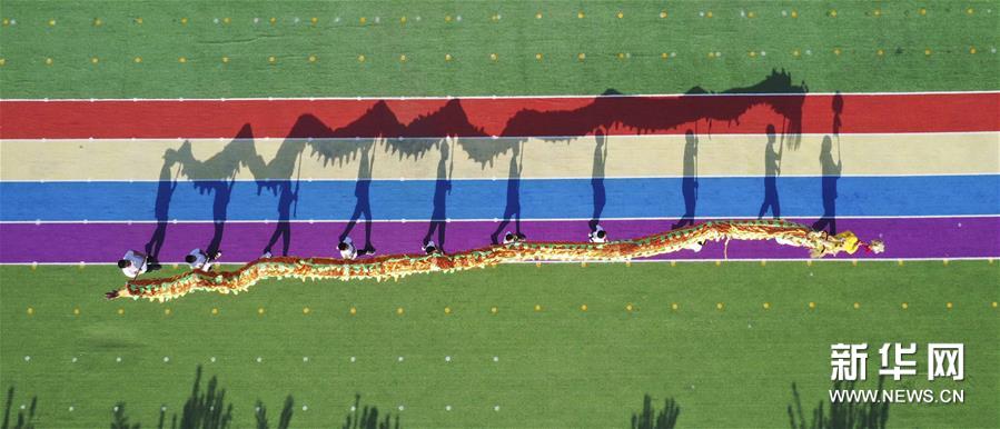8月4日,孩子们在河北省遵化市平安城镇大麻各庄村校园操场练习民俗节目(无人机照片)。新华社发(刘满仓 摄)