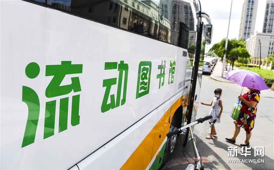 8月5日,在长春市一处社区服务点,市民进入“流动图书馆”借阅图书。新华社记者 许畅 摄
