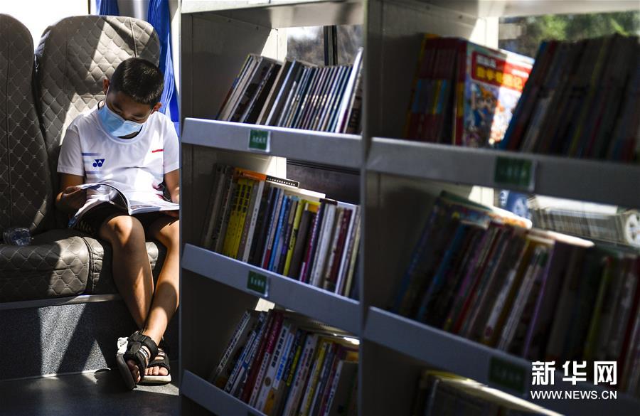 8月5日,一名小读者在“流动图书馆”里看书。新华社记者 许畅 摄