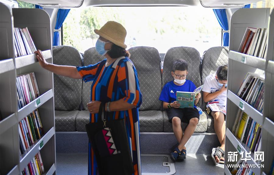 8月5日,长春市民在“流动图书馆”里看书。新华社记者 许畅 摄