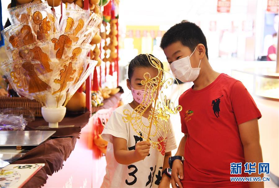 8月8日,两名小朋友在第十八届中关村国际美食节美食美酒嘉年华文创非遗展示区感受糖画魅力。