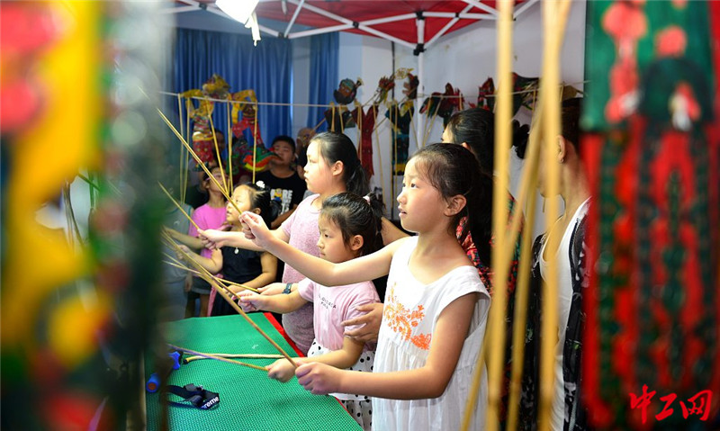 2020年8月10日,合肥,在汲桥新村社区,小朋友在体验皮影戏表演。葛传红/视觉中国