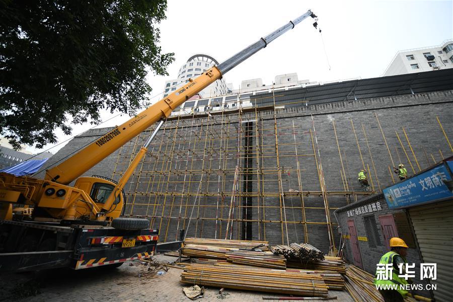 8月11日,西安市古代建筑工程公司的工人在明秦王府城墙遗址坍塌区域搭建脚手架。新华社记者 李一博 摄