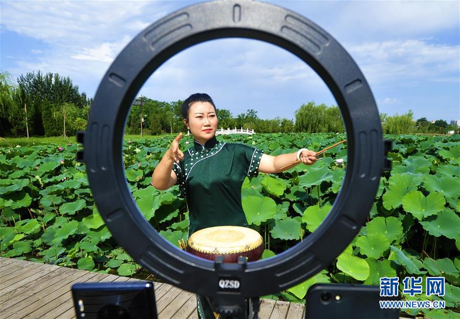 8月13日,河北省河间市西河大鼓非遗项目艺人李雪通过网络直播表演西河大鼓。 暑假期间,河北省河间市文化馆推出非遗展演“云端”播系列活动,组织当地西河大鼓非遗项目传承人利用视频直播的方式进行线上展演,通过“云端”传承非遗文化。 新华社记者 朱旭东 摄