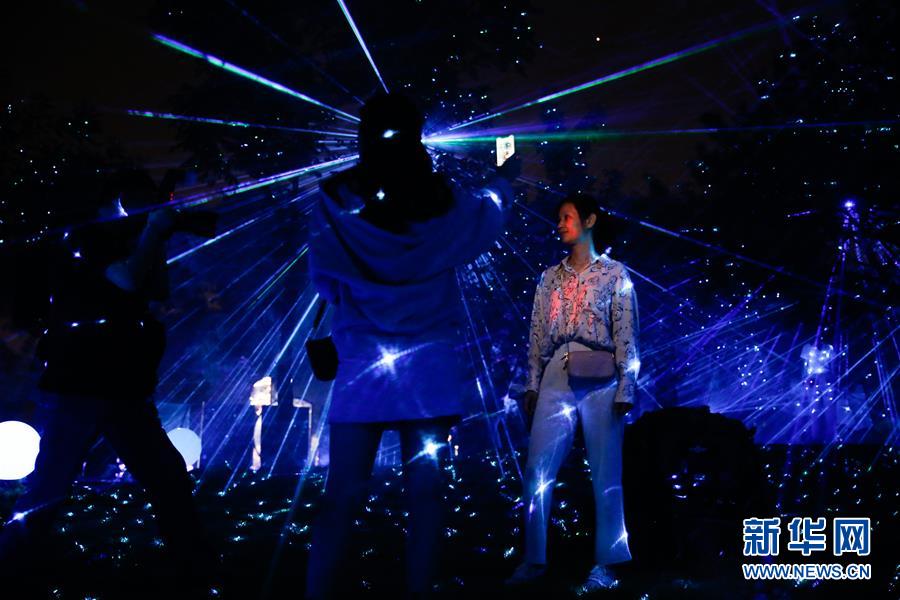 8月20日,在北京玉渊潭公园,一名女子在光影艺术作品中留影。 当日,北京国际光影艺术季(玉渊潭站)“万物共生”户外光影艺术沉浸式体验展在玉渊潭公园拉开帷幕。体验展结合灯光、激光、影像、音乐、表演等手段和特效装置,将光影艺术与公园自然景观相融合,让参观者领略灯光艺术之美。 新华社记者 张晨 摄