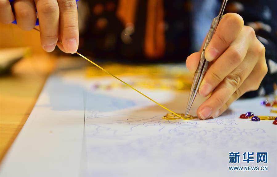 8月20日,在河北省石家庄市新华区非物质文化遗产展馆,“掐丝珐琅”专业老师在展示这项非遗技法。 新华社发(张晓峰 摄)