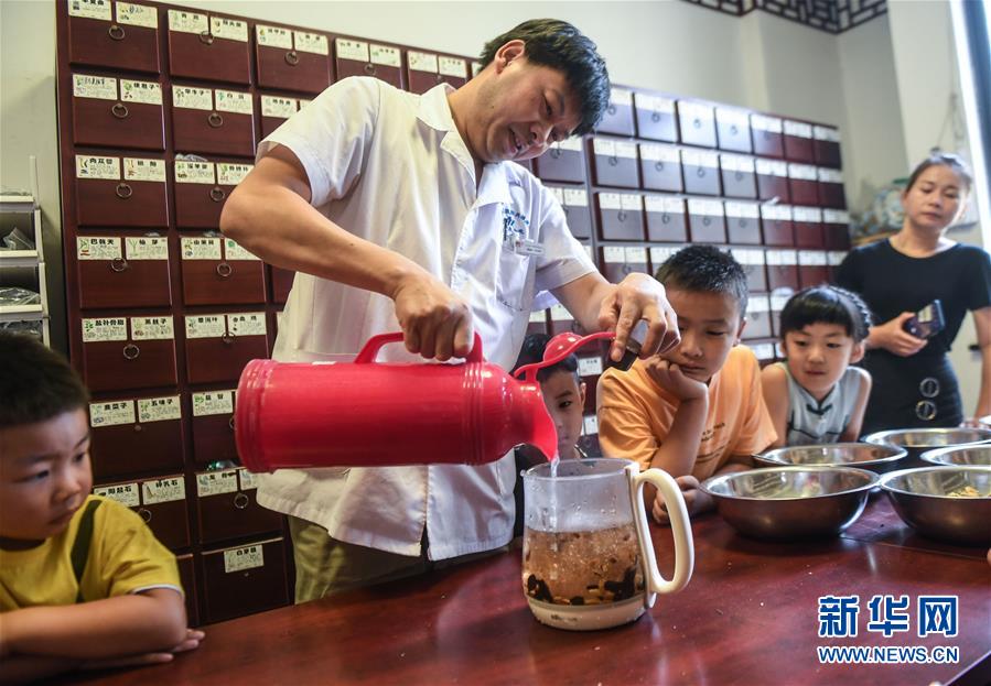 8月21日,医院医师在泡制中药凉茶。 当日,浙江省湖州市长兴县李家巷镇中心幼儿园、中心小学与长兴县中医院李家巷分院共同举办了以传统中药及凉茶为主题的暑期大课堂。参加活动的幼儿园孩子和小学生们在医院医师的带领下,了解传统中药的历史文化及相关知识,同时还根据中药凉茶配方选取药材、称重并泡制凉茶,让孩子们了解和传承传统中医药文化,丰富暑期生活。 新华社记者 徐昱 摄