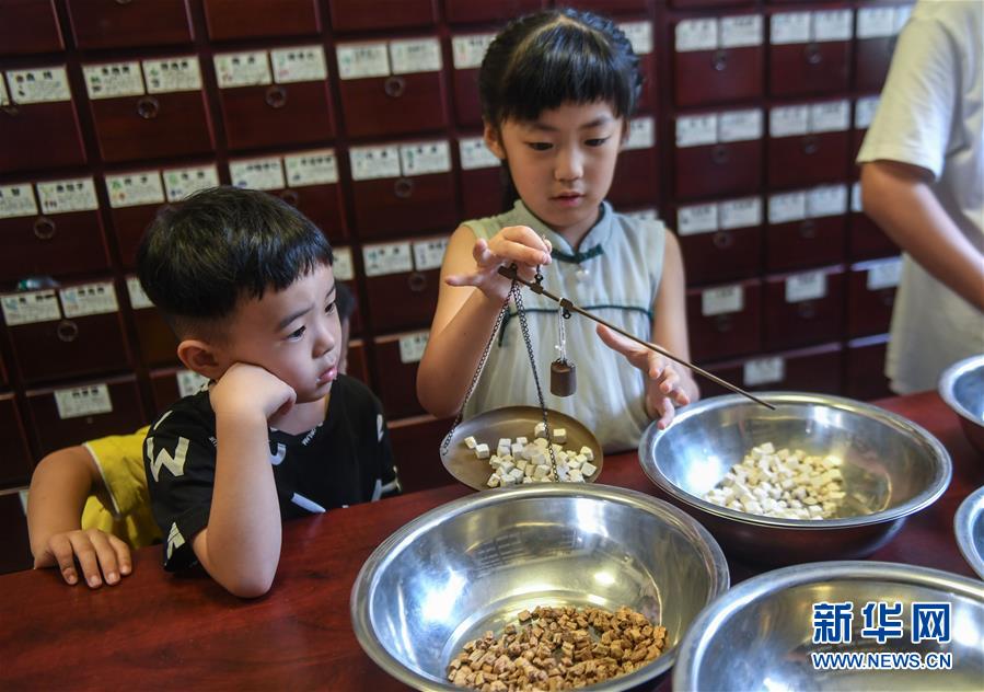 8月21日,孩子们在医院医师的带领下根据中药凉茶配方选取药材并对药材进行称重。 当日,浙江省湖州市长兴县李家巷镇中心幼儿园、中心小学与长兴县中医院李家巷分院共同举办了以传统中药及凉茶为主题的暑期大课堂。参加活动的幼儿园孩子和小学生们在医院医师的带领下,了解传统中药的历史文化及相关知识,同时还根据中药凉茶配方选取药材、称重并泡制凉茶,让孩子们了解和传承传统中医药文化,丰富暑期生活。 新华社记者 徐昱 摄