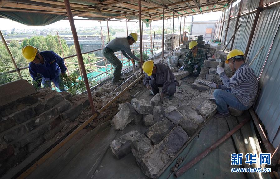 8月21日,工人在维修现场施工。 今年8月起,河北省秦皇岛市开始对山海关镇东楼城台本体进行维修,工程预计持续约1个月。 新华社记者 王毓国 摄