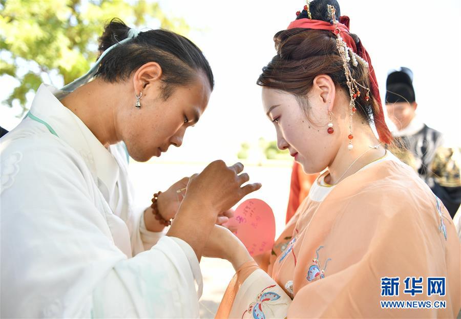 8月25日,身着传统服饰的年轻人在活动现场体验“穿针乞巧”。当日是农历七月初七,陕西西安大明宫国家遗址公园举办七夕节特别活动,参与活动的年轻人身着传统服饰,通过穿针乞巧、诗词接龙等展示传统文化魅力。新华社记者 张博文 摄