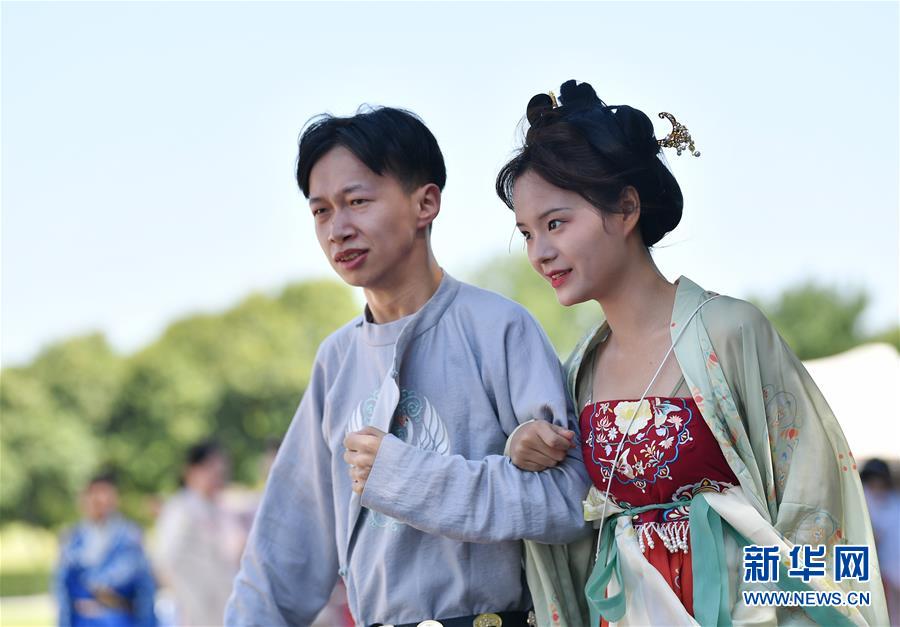 8月25日,年轻人在西安大明宫国家遗址公园七夕节活动现场展示传统服饰。当日是农历七月初七,陕西西安大明宫国家遗址公园举办七夕节特别活动,参与活动的年轻人身着传统服饰,通过穿针乞巧、诗词接龙等展示传统文化魅力。新华社记者 张博文 摄