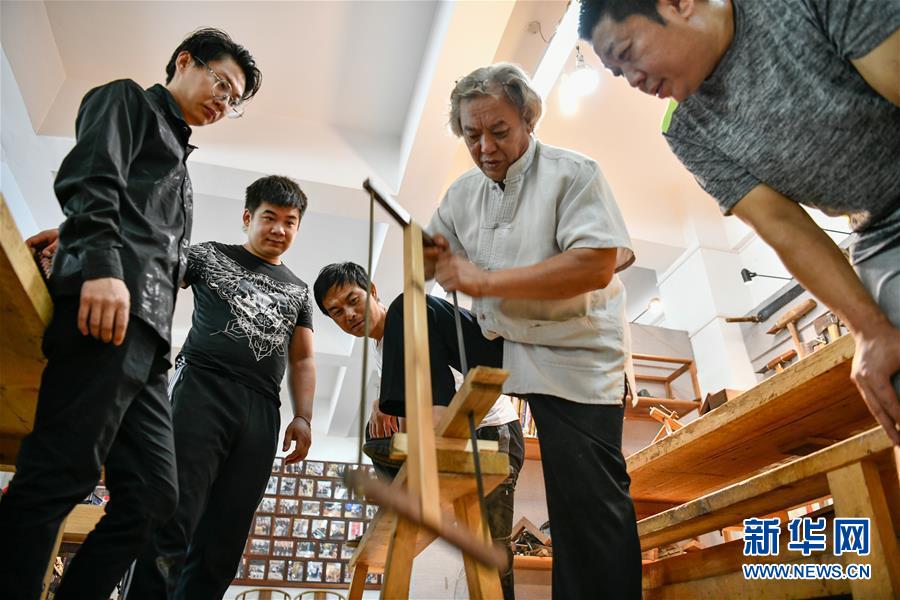 8月25日,在天津职业大学辛全生大师木艺工作室,辛全生(右二)给徒弟们演示开料流程。新华社发(孙凡越 摄)