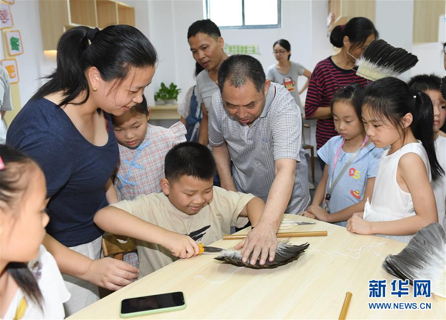 8月26日,小男孩在手工艺传承人指导下尝试制作羽毛扇。 当日,浙江省湖州市湖东街道组织辖区内青少年在社区活动中心手工羽扇工作室,了解羽毛扇制作技艺,学做羽毛扇,作为礼物送给父母。 新华社记者 翁忻旸 摄
