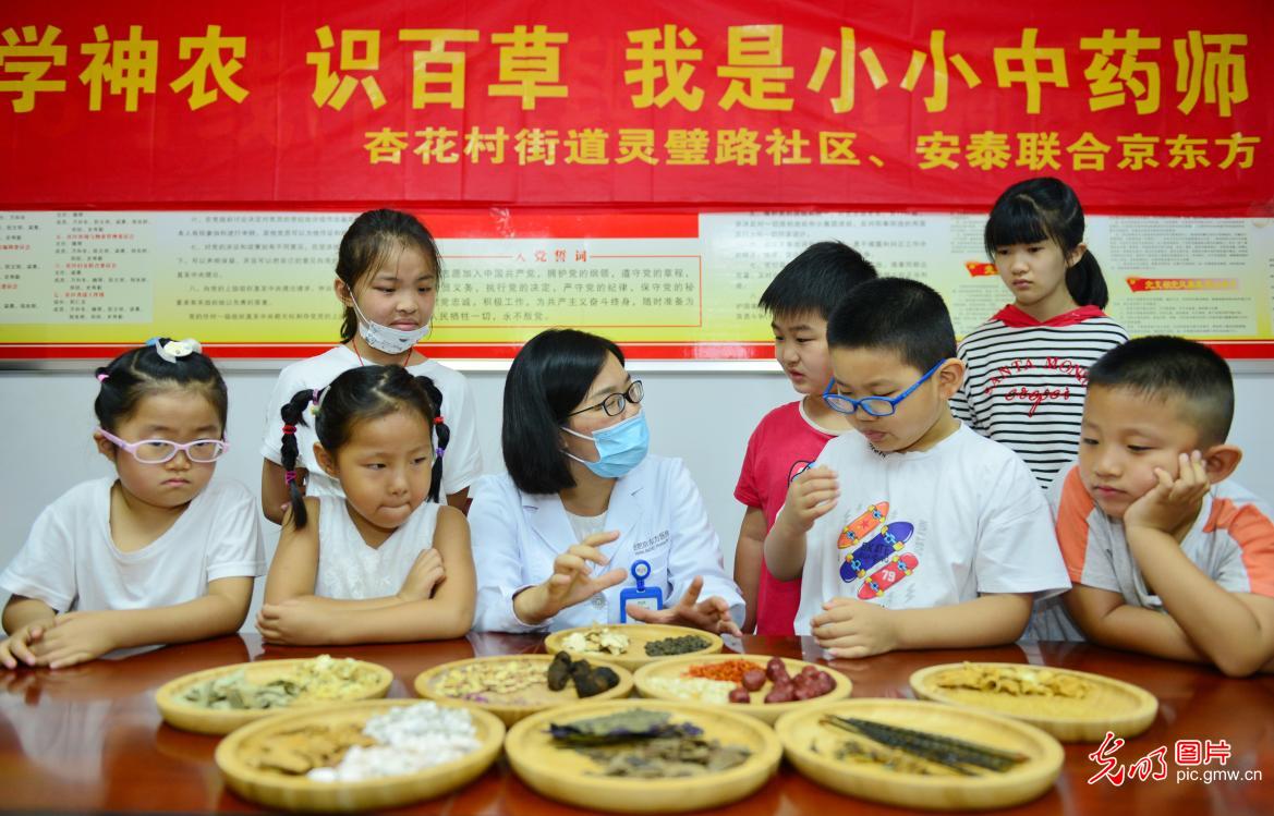 2020年8月27日,安徽省合肥市灵璧路社区开展"学神农 识百草我是小小中药师"活动,邀请辖区医院中药师来到社区小课堂为孩子们介绍中药知识,让小朋友近距离了解认识中药,感受中医药传统文化魅力。(葛传红摄/光明图片)