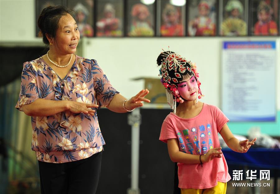8月27日,在青县木门店镇“哈哈腔”传承示范基地,老师给一名小学员授课。暑假期间,在河北省青县木门店镇“哈哈腔”传承示范基地,小学员们在老艺人的带领下学习“哈哈腔”的唱腔、身段和表演技巧,度过充实的假期。 “哈哈腔”是一种地方戏曲,演出内容以孝老爱亲、见义勇为、乐善好施的历史故事为主,2006年被列入国家级非物质文化遗产名录。新华社记者牟宇摄