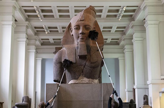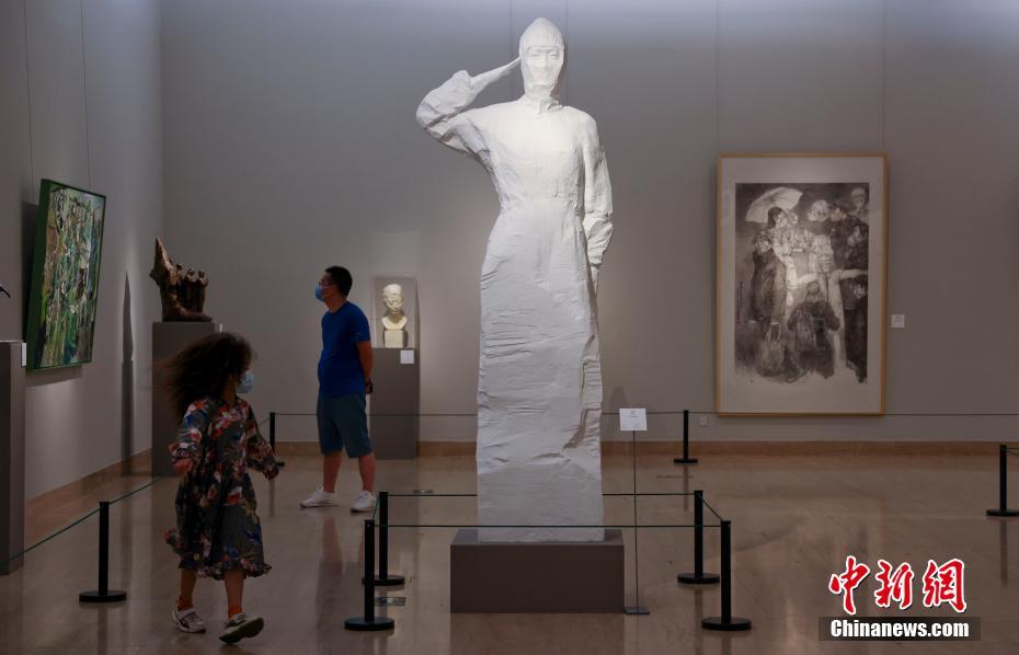 8月28日,北京,游客在中国美术馆参观“以美扶智——中国美术馆脱贫攻坚美术作品展”参展作品——吴为山雕塑《使命》。中新社记者 杜洋 摄