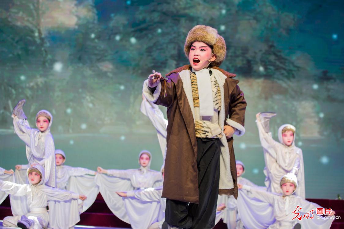 2020年8月29日,江苏省如皋市文化馆小剧场,学生在表演京剧《打虎上山》。为推动京剧传承与发展,"戏剧神韵"京剧交流活动在该市文化馆小剧场举办,让国粹艺术走进百姓心中。(徐慧摄/光明图片)