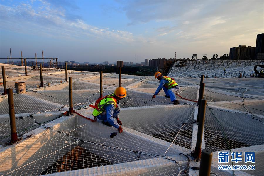 8月31日,在河南省郑州市河南省科技馆新馆建设工地,工人在进行转接柱的测量定位。 近日,河南省科技馆新馆的幕墙工程进入大规模施工阶段。河南省科技馆新馆项目是河南省建筑规模较大、投资金额较多的公益性项目之一,整个建筑外形为曲面造型,其中幕墙使用双层阳极氧化铝板37700多块,是整个工程项目的一大亮点。 新华社记者 冯大鹏 摄