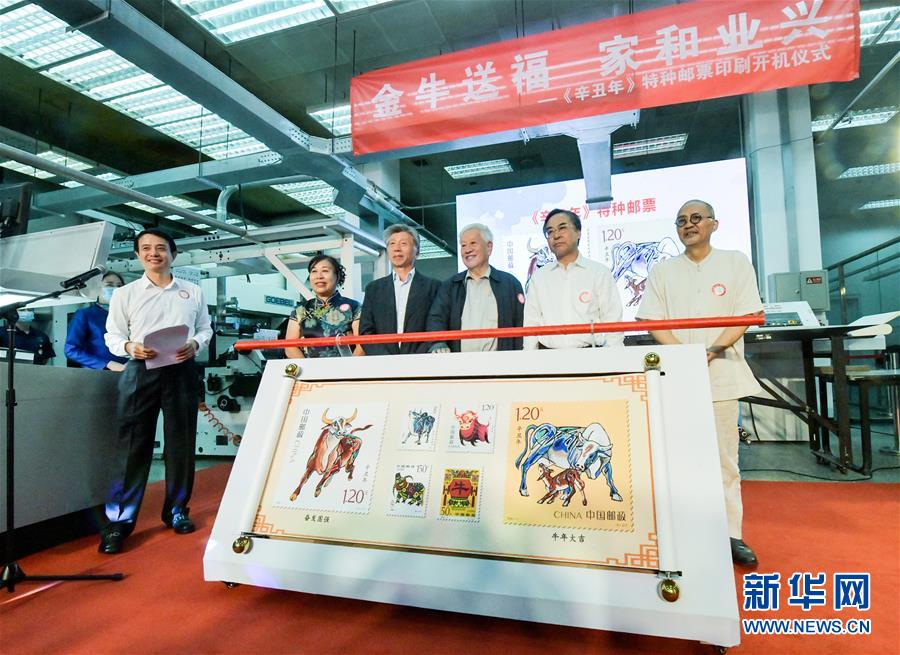 9月1日,在《辛丑年》特种邮票印刷开机仪式上,邮票设计者姚钟华(右三)同嘉宾一起为第一至第四套生肖牛年邮票揭幕展示。 当日,《辛丑年》特种邮票在北京邮票印制局开机印刷,宣告生肖牛年邮票正式投入生产。《辛丑年》特种邮票是中国生肖邮票序列第四轮中的第六套。 新华社记者 李贺 摄