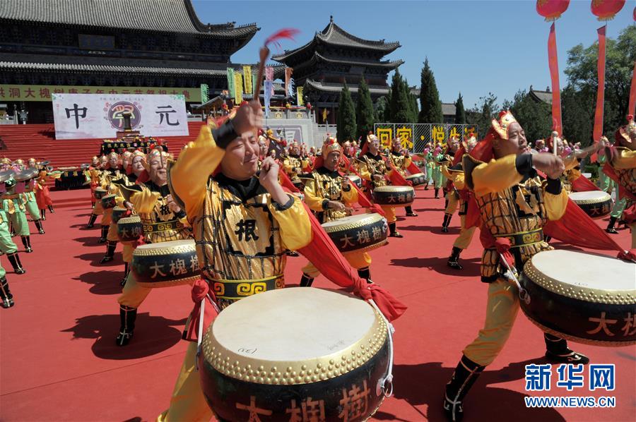 9月2日,演员在中元节祭祖活动中表演威风锣鼓。 当日,山西省洪洞县大槐树寻根祭祖园举行中元节祭祖活动。 新华社记者 马毅敏 摄