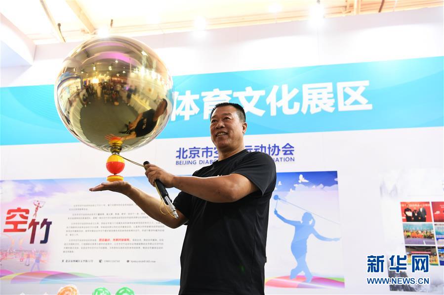 9月3日,参展者在服贸会专题展区中的文化体育融合展区表演“大金雷”空竹。 2020年中国国际服务贸易交易会将于9月4日-9日在北京举行。9月3日,受邀媒体记者来到位于北京奥林匹克公园中轴景观大道的专题展区进行探访。 新华社记者 尹栋逊 摄