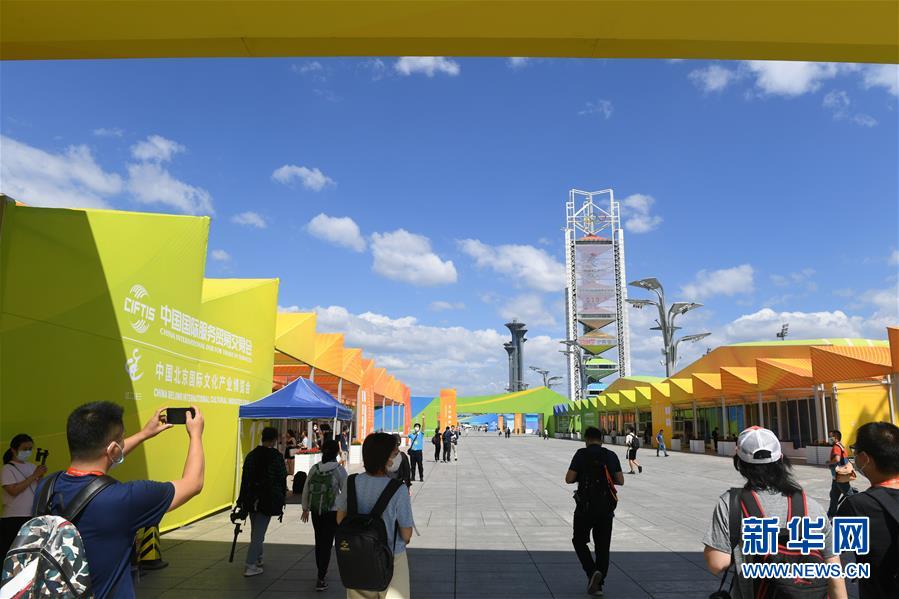 9月3日,受邀记者们在位于北京奥林匹克公园中轴景观大道的服贸会专题展区进行探访。 2020年中国国际服务贸易交易会将于9月4日-9日在北京举行。9月3日,受邀媒体记者来到位于北京奥林匹克公园中轴景观大道的专题展区进行探访。 新华社记者 鲁鹏 摄