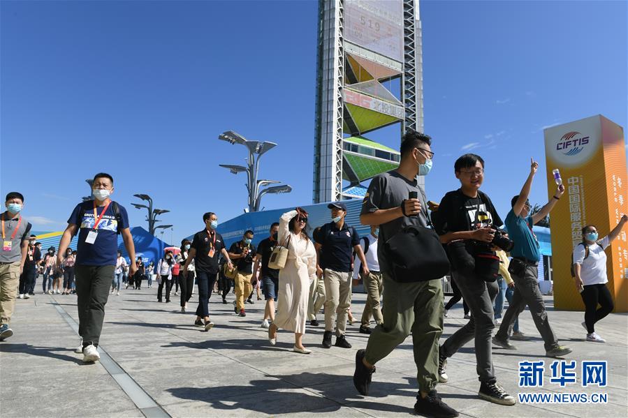 9月3日,受邀记者们在位于北京奥林匹克公园中轴景观大道的服贸会专题展区进行探访。 2020年中国国际服务贸易交易会将于9月4日-9日在北京举行。9月3日,受邀媒体记者来到位于北京奥林匹克公园中轴景观大道的专题展区进行探访。 新华社记者 鲁鹏 摄