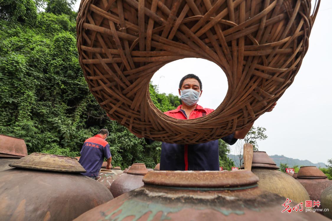 2020年9月3日,酿醋师傅正在检查晒醋情况。四川省宜宾市翠屏区思坡镇思坡镇的"酿醋史"已逾千年,其独到的工艺使之具有香、浓、酸、醇等特点,深受消费者青睐。"思坡醋传统酿造技艺"于2011年入选四川省非物质文化遗产保护名录。(庄歌尔摄/光明图片)