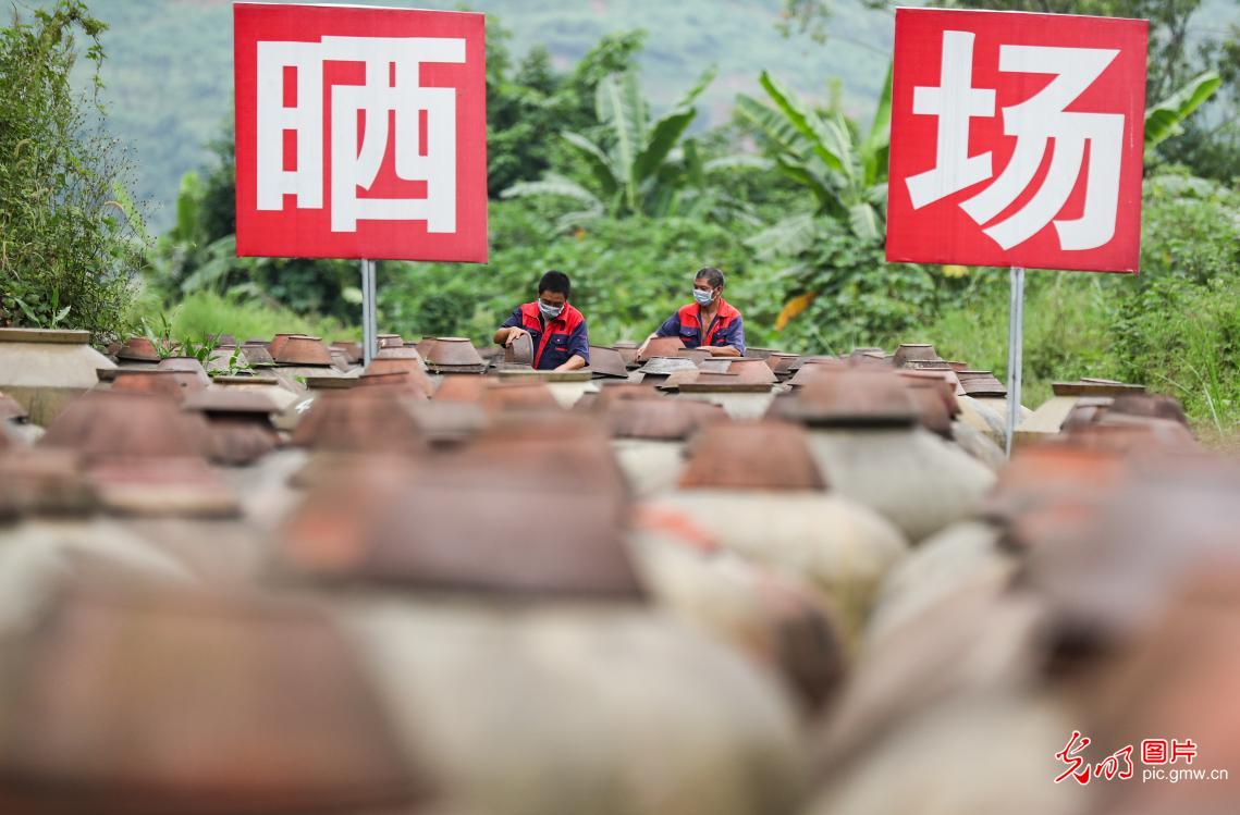 2020年9月3日,酿醋师傅正在检查晒醋情况。四川省宜宾市翠屏区思坡镇思坡镇的"酿醋史"已逾千年,其独到的工艺使之具有香、浓、酸、醇等特点,深受消费者青睐。"思坡醋传统酿造技艺"于2011年入选四川省非物质文化遗产保护名录。(庄歌尔摄/光明图片)