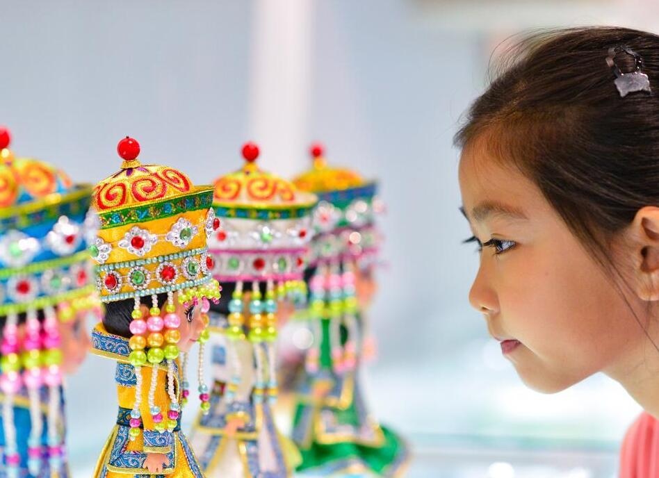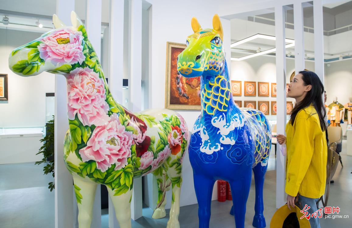 2020年9月6日,呼和浩特市,市民在内蒙古展览馆参观以"马文化"为主题的文创产品。当日是内蒙古自治区第16个“草原文化遗产保护日”,"内蒙古民族文化——传统工艺现代创意专题展"在位于呼和浩特市的内蒙古展览馆开展,千余款传统工艺品和文创产品,线上线下展示展销。(丁根厚摄/光明图片)