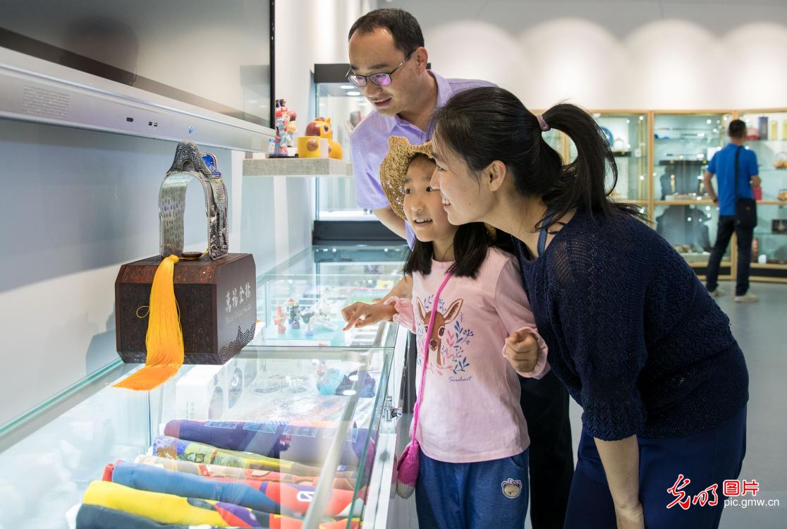 2020年9月6日,呼和浩特市,市民在内蒙古展览馆参观马鞍文创产品。当日是内蒙古自治区第16个“草原文化遗产保护日”,"内蒙古民族文化——传统工艺现代创意专题展"在位于呼和浩特市的内蒙古展览馆开展,千余款传统工艺品和文创产品,线上线下展示展销。(丁根厚摄/光明图片)