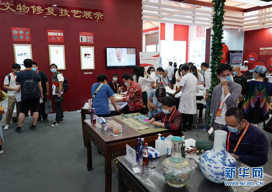 9月8日,观众在服贸会上参观文物修复技艺展示。 2020年中国国际服务贸易交易会9月4日至9日在北京举行。在本届服贸会文化服务专题展区,文物修复专家现场展示文物修复技艺,让观众近距离感受文物修复过程。 新华社记者 张晨霖 摄