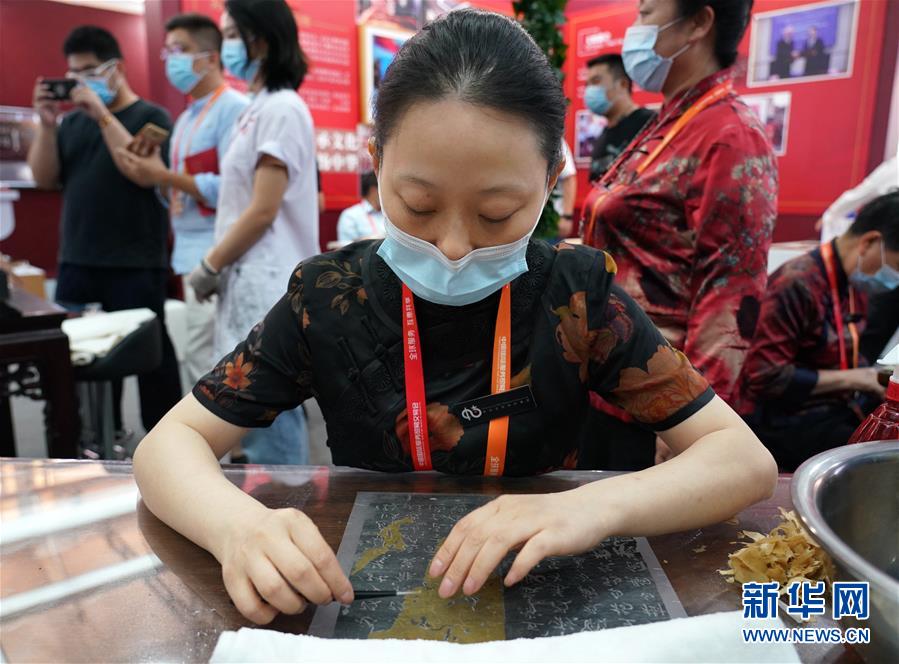 9月8日,文物修复专家严瑾芳在展示拓片修复技艺。 2020年中国国际服务贸易交易会9月4日至9日在北京举行。在本届服贸会文化服务专题展区,文物修复专家现场展示文物修复技艺,让观众近距离感受文物修复过程。 新华社记者 张晨霖 摄