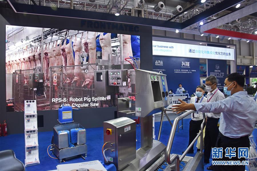 9月10日,观众在展会上了解食品机械产品。 当日,第十八届中国国际肉类工业展览会在山东省青岛市开幕。本届展览会有逾千家肉类、食品包装、配料、食品机械、冷链物流、金融等企业参展。 新华社记者 李紫恒 摄