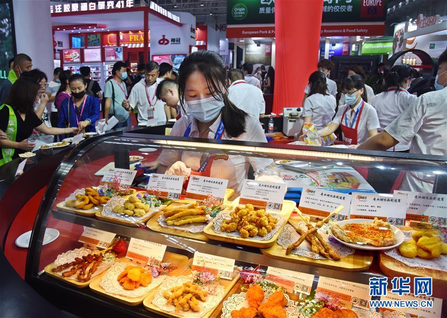 9月10日,一参展商在展会上现场制作肉类食品。 当日,第十八届中国国际肉类工业展览会在山东省青岛市开幕。本届展览会有逾千家肉类、食品包装、配料、食品机械、冷链物流、金融等企业参展。 新华社记者 李紫恒 摄
