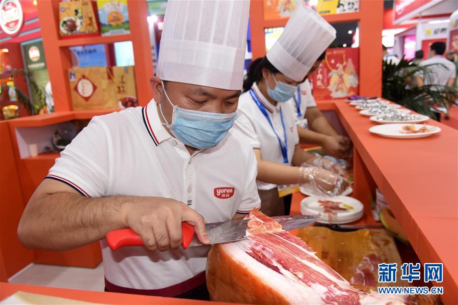 9月10日,一参展商在展会上现场制作肉类食品。 当日,第十八届中国国际肉类工业展览会在山东省青岛市开幕。本届展览会有逾千家肉类、食品包装、配料、食品机械、冷链物流、金融等企业参展。 新华社记者 李紫恒 摄