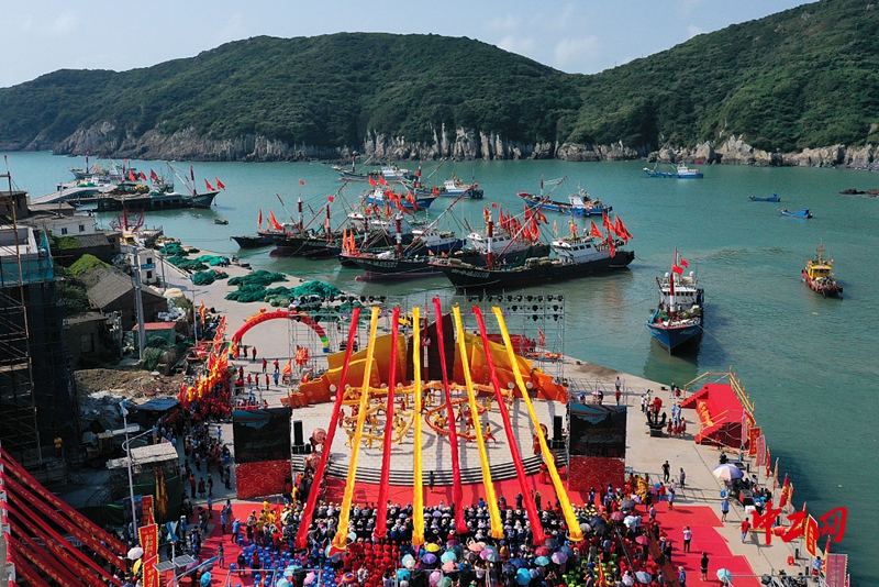 2020年9月10日上午,舟山市嵊泗县黄龙乡南港村码头广场鼓声阵阵、旌旗猎猎、“蛟龙腾飞”,第十七届黄龙渔民开捕节在此隆重举行。海岛人用祭海、文艺演出等形浙江舟山:黄龙岛举行开捕节式,祝福整装待发的渔民满载而归。