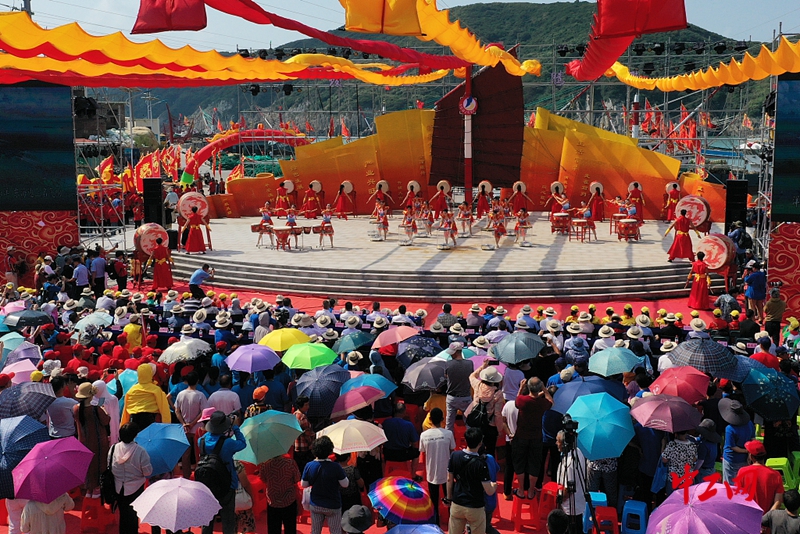 2020年9月10日上午,舟山市嵊泗县黄龙乡南港村码头广场鼓声阵阵、旌旗猎猎、“蛟龙腾飞”,第十七届黄龙渔民开捕节在此隆重举行。海岛人用祭海、文艺演出等形式,祝福整装待发的渔民满载而归。图片作者:姚峰/视觉中国