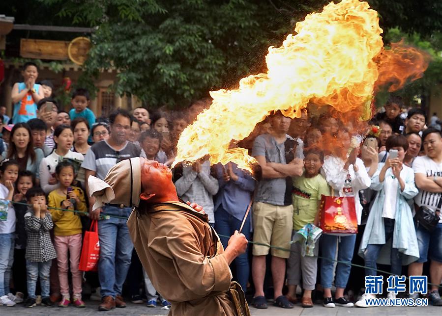 游客在开封的清明上河园景区内观赏表演(2016年5月2日摄)。新华社记者 李安 摄
