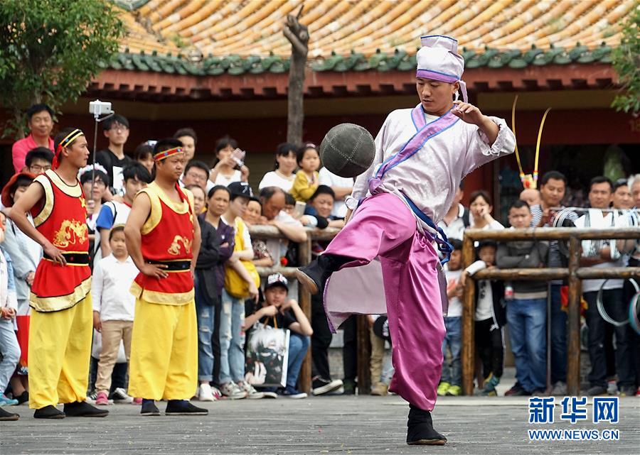 游客在开封的清明上河园景区内观赏蹴鞠表演(2016年5月2日摄)。新华社记者 李安 摄