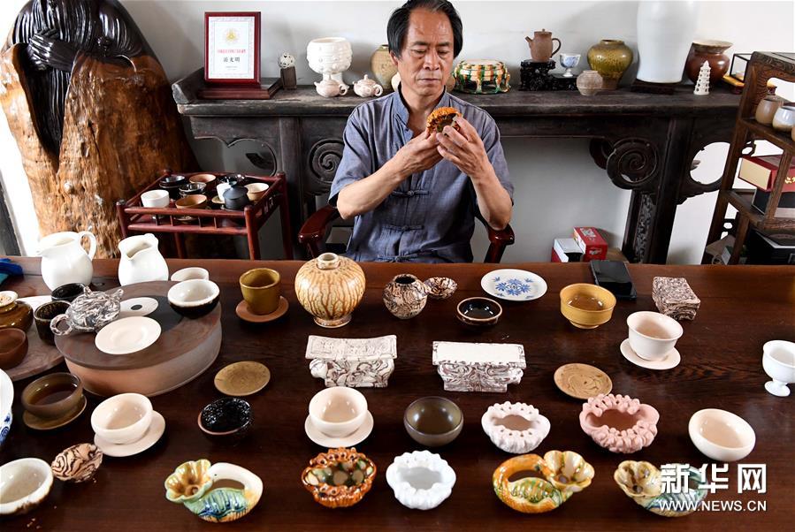 在河南省巩义市站街镇小黄冶村的工作室里,游光明在查看他烧制的“三彩雕花杯”(6月19日摄)。新华社记者 李安 摄